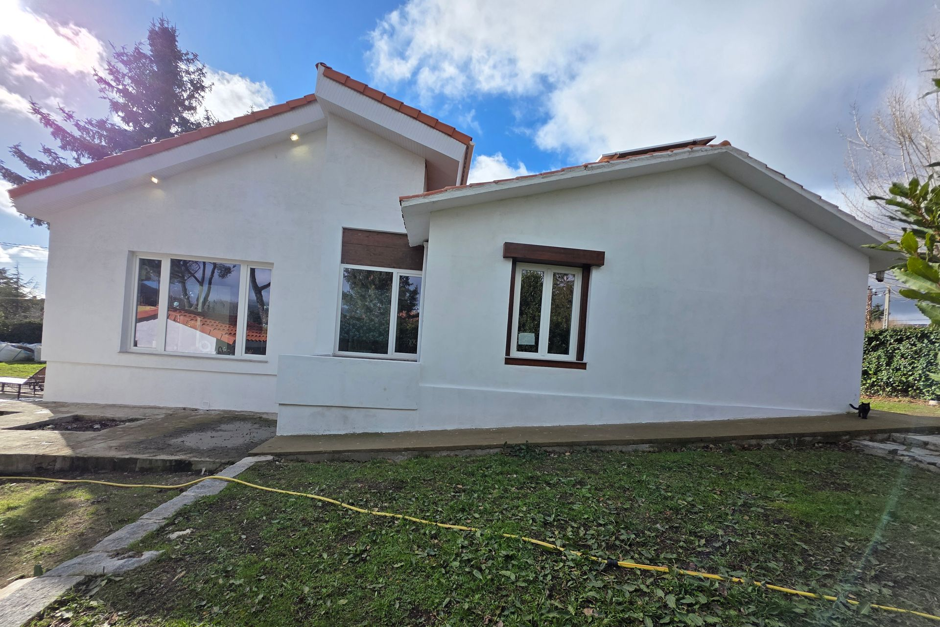 Actuación completa en el exterior de la vivienda que incluye la anulación de piscina existente, retirada de palmera, renovación de pavimentos y paramentos, cambio de puertas, instalación eléctrica exterior con iluminación, renovación de baños y reparación integral del saneamiento exterior, mejorando funcionalidad, seguridad y estética del conjunto.