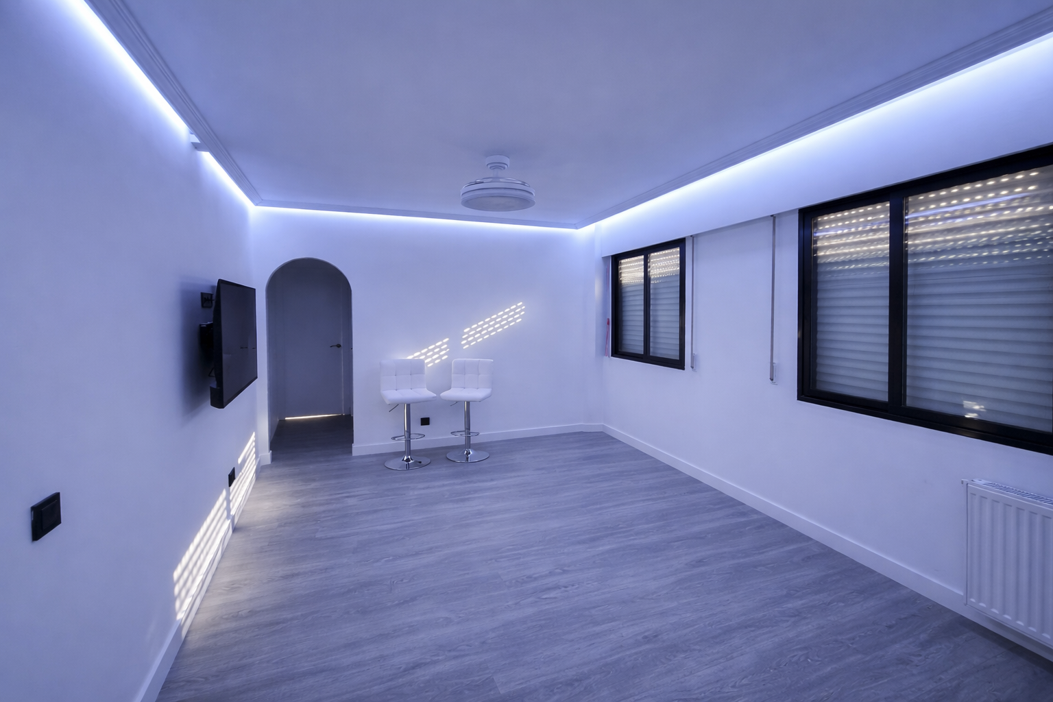 Ejecución de reforma integral con demolición completa de espacios interiores, renovación de suelos y paramentos, alisado de techos, instalación de baño totalmente equipado, cocina con isla y cerramiento de terraza mediante ladrillos de cristal.